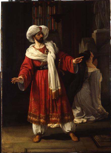 - NOTIZIE STORICO CRITICHE Se in occasione della "Mostra dei maestri di Brera" il dipinto veniva genericamente indicato con il titolo "Scena orientale" e con una datazione risalente agli anni Quaranta, è stato successivamente riconosciuto con il "ritratto, figura intiera in abito teatrale" presentato da Hayez all'Esposizione del 1830 su commissione della contessa russa Giulia Samoyloff Phalen, che aveva incaricato il pittore proprio in quello stesso anno. La tela illustra una scena del melodramma "Gli arabi nelle Gallie" di Giovanni Pacini, allora amante in carica della committenta. Hayez illustra la scena focalizzando l'attenzione sul cantante David in costume di scena che, come riportavano le pubblicazioni coeve "non molto favorevole presentavasi all'arte". Ecco allora la superba invezione del costume e del violento impatto, quasi da cartellone, con cui la figura si pone in posa in meniera decisa e perentoria a dominare il primo piano. Con quest'opera il maestro voleva gareggiare con il contemporaneo Molteni (che in quegli anni stava riscuotendo un forte successo per le sue abilità ritrattistiche) nella resa del costume, dei preziosi dettagli, del sontuoso panneggio e nelle pieghe del turbante, in un "tour de force decorativo" che superava le critiche ,mosse sulle pagine della "Biblioteca Italiana" sulla fisionomia e la posa del ritratto.