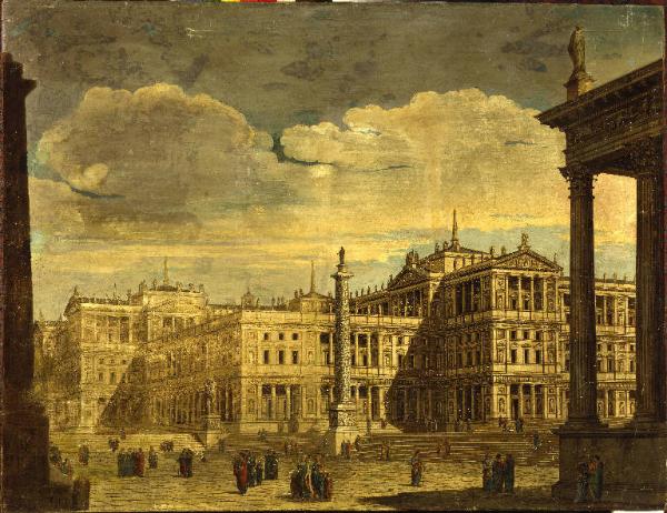 - NOTIZIE STORICO CRITICHE Si suppone che il dipinto sia entrato in Accademia come saggio finale e presentato all'annuale Esposizione di Brera. La veduta di grandi dimensioni rivela qualche incertezza nelle proporzioni degli edifici. Le figurette vestite secondo le fogge romane, date con tratto veloce e sicuro, sottolineano il gusto scenografico che ispira l'opera: sono evidenti infatti delle consonanze stilistiche con diversi studi scenografici dell'autore, come il "Foro" per la "Virginia" di P. Casella del 1812, un foglio dal tratto rigoroso e pulito, molto vicino alla tempera in questione.