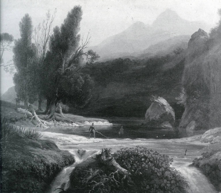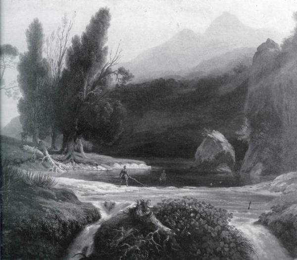 - NOTIZIE STORICO CRITICHE Il dipinto, probabilmente esposto alla mostra di Brera del 1839, è una derivazione del soggetto, con diversa iconografia, realizzato nel 1834 per il conte Paolo Tosio Martinengo di Brescia. Come riportato in la "Biblioteca Italiana", sebbene il D'Azeglio tratti il soggetto ariostesco in maniera egregia, la foga nel trattare questo tema (quello stesso anno porta in esposizione altre due tele tratte dall'"Orlando furioso") "dovette imprimere ne' suoi lavori una qualche somiglianza a malgrado della più fervida fantasia.". Il paesaggio si configura come un'unione fra paesaggio naturale e paesaggio fantastico, in cui lo straordinario ed il sublime vengono definiti attraverso l'attenzione ai dati atmosferici, la resa delle rocce, gli alberi frondosi e spezzati, in linea con il gusto trobadour di ambito piemontese, diffuso da libri d'incisione come "Il Viaggio romantico pittorico" di Modesto Paroletti con illustrazioni di Francesco Gonin. L'opera può essere avvicinata all'acquerello "Paesaggio ariostesco", derivato da un'ottava del poeta ferrarese.