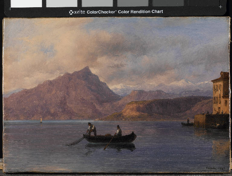 - NOTIZIE STORICO CRITICHE La tela, molto semplice e scarna, rappresenta la veduta del lago di Garda. Il piccolo paesaggio, realizzato con una pennellata magra e poco coprente (si notano infatti le tracce del disegno sottostante) è giocato interamente sui toni rosati e azzurri. La tela fa parte delle ultimi produzioni pittoriche del Canella caratterizzate da una certa caduta qualitativa.