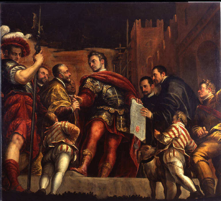 - NOTIZIE STORICO CRITICHE Dall'inventario napoleonico, pare che le tele, ascritte indistintamente alla "Scuola di Marco Ricci", pervennero a Brera poichè furono cedute dalla Direzione Generale della Pubblica Istruzione. Più probabilmente, come ipotizza anche il Miotti (1989), le tele provennero da Vicenza o dalla sua provincia e, forse, facevano parte del Ciclo del Collegio dei Notari di Vicenza a cui lavoararono anche il Maganza e il Carpioni. Nel 1677 il Boschini, riguardo all'opera in esame che egli titola "L'imperatore che concede alcuni privilegi", ne dà la collocazione originaria sul soffitto sopra il Tribunale dei Presidenti del Collegio e ne indica l'autore in Giovanni Fasolo. La tela potrebbe appartenere alla Scuola Vicentina per la qualità dei ritratti (le figura a destra dell'imperatore) e per l'attenzione cromatica, in particolare agli abiti vivaci dei paggetti che ricordano la pittura del Veronese.