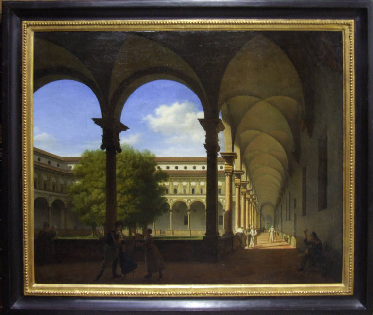 - NOTIZIE STORICO CRITICHE Il dipinto venne realizzato su ordinazione del Ministro Vaccari il quale, desideroso di acquistare un "Interno del Monastero Maggiore" esposto a Brera nel 1813 ma già venduto, commissionava a Fradelle, tramite il segretario dell'Accademia Giuseppe Zanoja, la veduta in esame che venne acquistata dall'Accademia per 50 Luigi. La tela venne esposta alla mostra di Brera del 1814 e, successivamente, alla rassegna del 1816. La meticolosa descrizione e gli effetti di luce assai "pittoreschi" sono da ricondurre alla pittura di gustoi neofiammingo presente nel 1814 alla mostra braidense, e al dipinto "Veduta del chiostro del Monastero Maggiore con figure istoriate" sempre esposta in quell'anno. Anche Giovanni Migliara espose, sempre nel 1814, il dipinto "Cortile dell'Ospedale Maggiore", avvicinandosi anch'egli al gusto trobadour, inserendo in un'architettura fortemente prospettica scene di invenzione a carattere annedotico, così come fece più tardi, nel 1844, anche Teodolinda Sabatino, la quale espose a Brera un identico soggetto. "Il portico del gran cortile dell'Ospedale Maggiore" sarà, infine, un tema dei Concorsi di Seconda Classe per la Scuola di Prospettiva nel 1853.