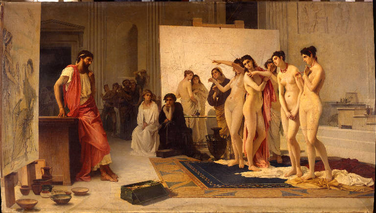 - NOTIZIE STORICO CRITICHE La tela entrò nelle collezioni dell'Accademia perchè partecipante al Concorso Canonica indetto per il 1869, ed il cui tema era stato desunto da un episodio della vita di Zeusi narrato da Carlo Roberto Dati nelle sue "Vite de'pittori antichi" (1667). Benchè in quest'edizione del concorso il premio era stato addirittura triplicato per creare maggiore competizione tra i concorrenti (tremilaottocento lire), vi partecipò comunque il solo Michis che contrassegnava il suo dipinto con il motto "Zeusi". La commissione giudicatrice, però, non ritenne opportuno premiare l'opera ma, tuttavia, decise di incoraggiare il concorrente assegnandoli duemila lire e trattenendo la tela per inserirla nelle proprie collezioni. Lo stesso Michis nella relazione per il dipinto, ravvisava le difficoltà del tema e la sua indecisione nel risolvere alcuni problemi di carattere tecnico, oltre ad aggiungere i chiarimenti necessari per la lettura iconografica dell'opera (Milano, ASAB, Carpi B II 1).