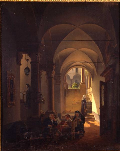 - NOTIZIE STORICO CRITICHE Anche questo dipinto giunse in Accademia con il legato del conte Stampa (1900). Questa veduta, come l'"Interno di chiesa", si rifà al gusto neofiammingo tipico della Francia della Restaurazione; infatti, contemporaneamente al Migliara, negli anni 1813 e 1814, anche il francese Fradelle porta alle Esposizioni braidensi "diversi chiostri" e "due vedute l'una del chiostro del Monastero Maggiore (...) l'altra del cortile dello Spedale militare di S. Ambrogio in Milano". Le vedute del Migliara, sebbene ispirate dalla pittura trobadour francese, evitavano la sovrapposizione con temi tratti dalla letteratura ma, anzi, cercavano di offrire al pubblico un repertorio iconico in cui era facile essere coinvolti.