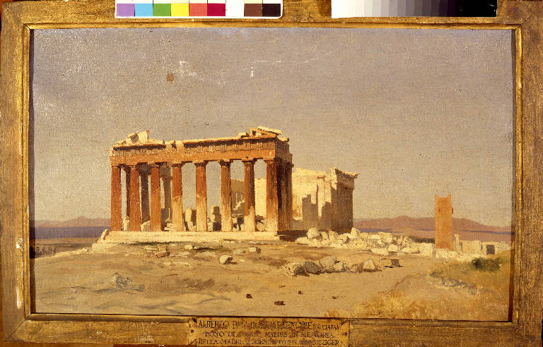 - NOTIZIE STORICO CRITICHE Il piccolo dipinto venne esposto alla Galleria Centrale d'Arte di Milano nel 1917 in occasione della vendita della produzione di Pasini lasciata in eredità. La tela venne acquistata da Agnese Mylius e successivamente donata all'Accademia in memoria della madre Eugenia Mylius Schmutzinger. Questa veduta fa parte di un gruppo di tre opere rappresentanti panorami ateniesi che il pittore traspose nelle sue tele in occasione del viaggio in Grecia compiuto tra il 1859 e il 1860.