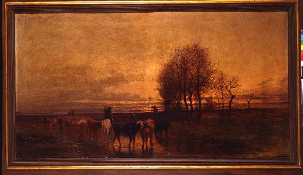 - NOTIZIE STORICO CRITICHE La tela, molto simile a "Animali condotti ad abbeverare", come segnalato nel Registro del 1947 entrò in Accademia tramite acquisto al prezzo di 450 lire. Come nell'altra tela, la narrazione è affidata ad un tramonto infuocato su cui si staglia in controluce la figura dell'uomo a cavallo e la mandria di vacche. L'opera potrebbe essere stata dipinta durante il soggiorno romano dell'artista negli anni Settanta: nelle tele ivi prodotte, l'artista tocca infatti momenti di paesaggismo puro di intensa sensibilità.