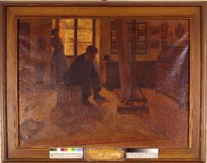 - NOTIZIE STORICO CRITICHE Il dipinto entrò nelle collezioni dell'Accademia perch vincitore al Premio Mylius per la pittura di genere indetto per l'anno 1902, il quale prevedeva una "scena di uno studio d'artista". Il lavoro del pittore, giocando con l'associazione fra la nebbia che cancella il paesaggio esterno e la mancanza di ispirazione che attanaglia l'artista, venne apprezzato dalla commissione per "l'intensità di sentimento espressa con mezzi tanto semplici e con grande sincerità di visione". Di diverso parere era, invece, la critica coeva che giudicavano il quadro banale, superficiale ed estraneo ai richiesti "criteri di modernità e di semplicità" in quanto in esso "linee e colori tutto è incerto" o, ancora, come riportato sulle pagine de "Il Tempo", privo di sentimento e di "interesse intellettuale".