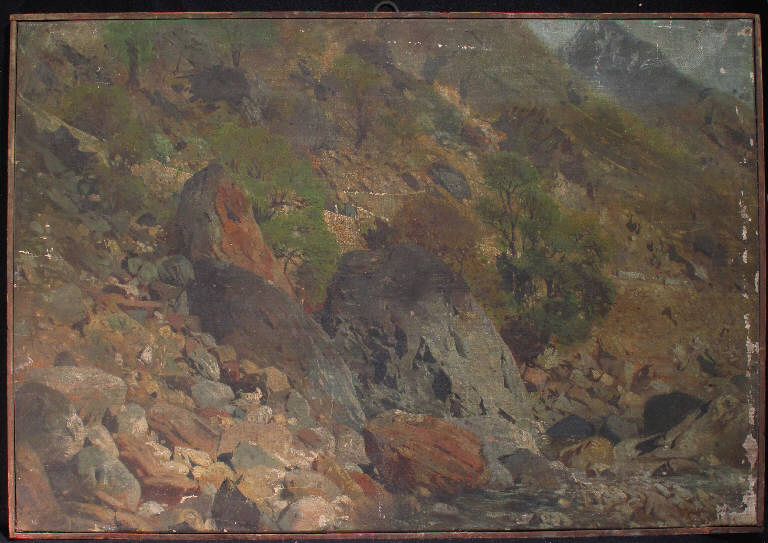 - NOTIZIE STORICO CRITICHE Il dipinto, pervenuto in Accademia come ignoto, per il carattere impressionistico e il fitto gioco di ombre e luci che modella le rocce agli argini del fiume, è collocabile nell'ultimo trentennio del XIX secolo. Dalla documentazione conservata in Accademia risulta, però, che nel 1871 venne pagata la somma di cento lire al signor Luigi Rossi "per la cessione di alcuni studi dal vero": tra questi, potremmo identificare questa tela con il paesaggio "Il letto del Ticino (Valle di Blenio)" esposto a Brera proprio in quell'anno. Inoltre, il confronto stilistico con l'opera "Fiume a Brenno" realizzata due anni dopo, ci consente di attrbuire con certezza questa tela al Rossi.