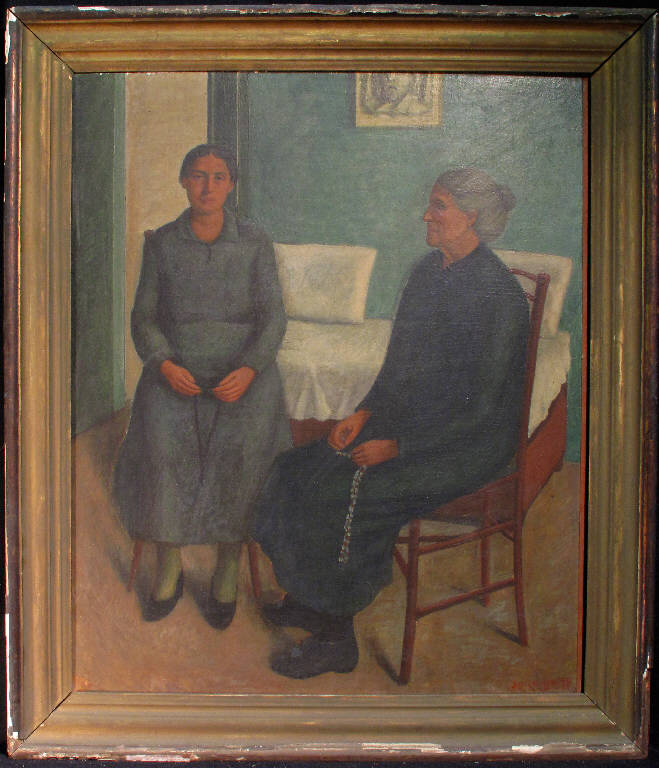 - NOTIZIE STORICO CRITICHE Il dipinto, presentato in occasione della V Mostra del Sindacato Fascista del 1934, ottenne il Premio della Fondazione Cassani entrando così a far parte della collezione dell'Accademia. Benchè vincitore, il quadro dello Speranza non incontrò il favore della critica, tanto che sulle pagine dell'"Illustrazione Italiana" veniva definito un "quadretto votivo". Come in molte sue opere, anche in questa scena, ambientata in una stanza spoglia e famigliare ed il cui silenzio è interrotto solo dalle due donne intente a recitare il rosario, lo Speranza rievoca i propri ricordi, a cominciare dal ritratto della donna di profilo identificabile con la propria anziana madre, il cui ritratto, "Ritratto di mia madre", è oggi conservato presso la Galleria d'Arte Moderna di Milano. In questa tela appare pressochè evidente l'influenza delle teorie primitiviste, ed in particolare la sua passione per il Quattrocento italiano, ravvisabili nella ripartizione calibrata dello spazio, nello studio dei volumi e nella rigidità delle figure.