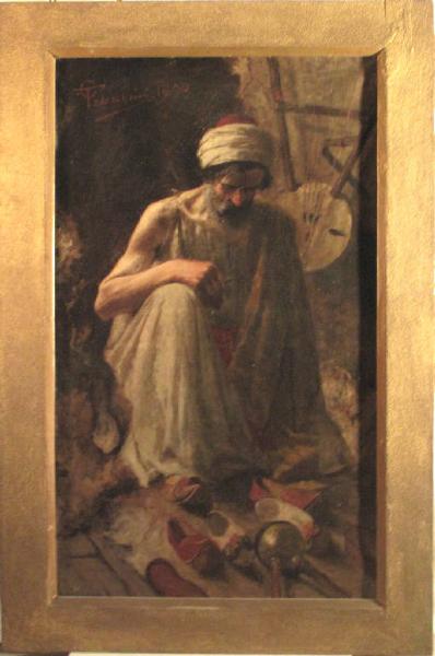 - NOTIZIE STORICO CRITICHE La tela venne presentata come saggio del secondo anno del pensionato Oggioni che il giovane Todeschini vinse nel 1886. Nel 1889, l'artista aveva infatti presentato un primo elaborato che la commissione si rifiutò di accettare e che venne sostituito da questo realizzato l'anno successivo. Benchè venisse accettato ed accolto nella collezione dell'Accademia, la commissione non mancò di sottolineare "che è però spiacevole che mentre la parte superiore delle figure è commendevole il resto non corrisponda, principalmente nel disegno scorretto soprattutto poi nell'unica mano, e non si capisce tutta la parte sinistra delle figure". Il dipinto, eseguito con tocchi rapidi e vibranti, è ancora pervaso da una certo accademismo, ravvisabile nella rigidità della figura, benchè mitigato dalle tendenze realistiche dell'epoca, riscontrabili negli oggetti in primo piano.