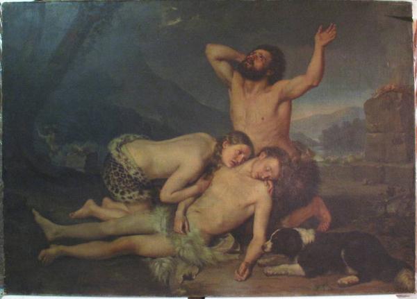 - NOTIZIE STORICO CRITICHE La tela del giovane pittore emiliano Carlo Zatti risultò vincitrice al Grande Concorso indetto per l'anno 1837, il cui tema prevedeva l'illustrazione di un episodio biblico, ovvero l'omidio di Abele. La commissione esaminatrice, presieduta dal veneto Francesco Hayez, decretò onorevole del premio il dipinto contrassegnato dal motto "Refrigerante impiastro è la speranza", anche se l'opera non aveva ottenuto un consenso unanime. L'assegnazione del premio venne infatti agevolata anche dal fatto che in una precedente edizione era stata proposta la "tramelogedia" "Abele" di Vittorio Alfieri, a cui però non seguì alcun vincitore. Dell'opera venne lodata soprattutto la composizione , anche se non si mancò di sottolineare l'anatomia poco corretta del braccio di Adamo e la posa "ingrata" di Eva. Se la raffigurazione dei tre personaggi, ancora immersi in un gusto classicheggiante, riflette la lezione di Benvenuti, il realismo di alcuni elementi (le pelliccie e il cane, ad esempio) tradisce invece l'influsso di Giuseppe Bezzuoli: di entrambi i pittori, infatti, lo Zatti era stato allievo presso l'Accademia di Firenze. L'attenzione all'indagine del vero si riflette anche nel corpo di Abele, per il quale lo Zatti pare abbia preso a modello la scultura coeva di Giovanni Duprè (1844). Del quadro esiste anche un'incisione realizzata per il volume "Grandi Concorsi..." edito nel 1843 (tav. XCIV).