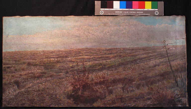 - NOTIZIE STORICO CRITICHE Presente negli inventari accademici con il titolo "Paesaggio in pianura (moderno)" pervenuto in Accademia come saggio finale, l'opera può essere invece identificata con la tela "Aspri sentieri siciliani" presentata all'Esposizione Nazionale di Belle Arti nel 1908 che, presente nell'elenco dei quadri ammessi alla mostra, non figura nel catalogo della stessa. Notizie d'archivio ci informano però che il dipinto - che non venne mai restituito all'artista - venne acquisto dall'istituzione braidense. La tela dimostra la notevole sensibilità materica dell'autore che, con delicati tocchi nervosi, riesce a rendere tutta l'atmosfera della terra siciliana.
