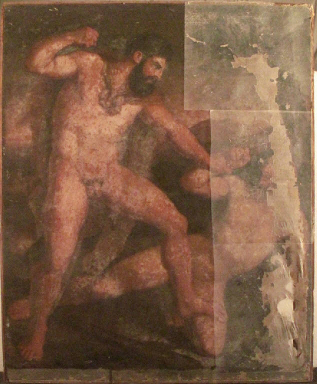 • NOTIZIE STORICO CRITICHE La tela rappresenta un soggetto mitologico, la lotta tra Ercole e Caco, senza alcuna ambizione di approfondimento iconografico; le due figure virili sono infatti pretesto per uno studio anatomico e dell'espressione dei volti, rivolgendosi per lo più ai modelli della statuaria classica che alla verosimiglianza fisionomica. Sullo sfondo, un paesaggio d'invenzione. Il dipinto, databile tra il 1825 e il 1835 circa, potrebbe essere identificato come un premio accademico di seconda classe, riservato agli alunni.