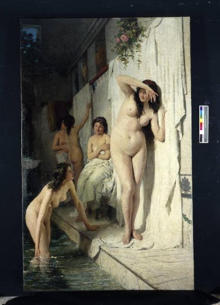 - NOTIZIE STORICO CRITICHE La tela vincitrice del Concorso Canonica nel 1872 che prevedeva come soggetto "Una sala dei bagni di Pompei", è uno degli esempi di composizioni pittoriche con nudi femminili grandi al vero in voga sin dalla metà dell'Ottocento. La grande tela di Barbaglia rivela il precoce interesse di un artista, che percorrerà la strada del naturalismo lombardo, per una resa realistica sia della figura, sia degli elementi iconografici caratterizzanti il tema. Il dipinto è caratterizzato dalla larga e ricca materia pittorica dei panneggi, dalla resa veritiera dell'acqua della piscina. Dell'opera esiste uno studio preparatorio a matita, donato nel 1920 da Vittore Grubicy al Comune di Milano. Un dipinto con lo stesso titolo, allora di proprietà di Luigi Rebustello, risulta infine esposto alla mostra postuma organizzata alla Permanente nel 1911.