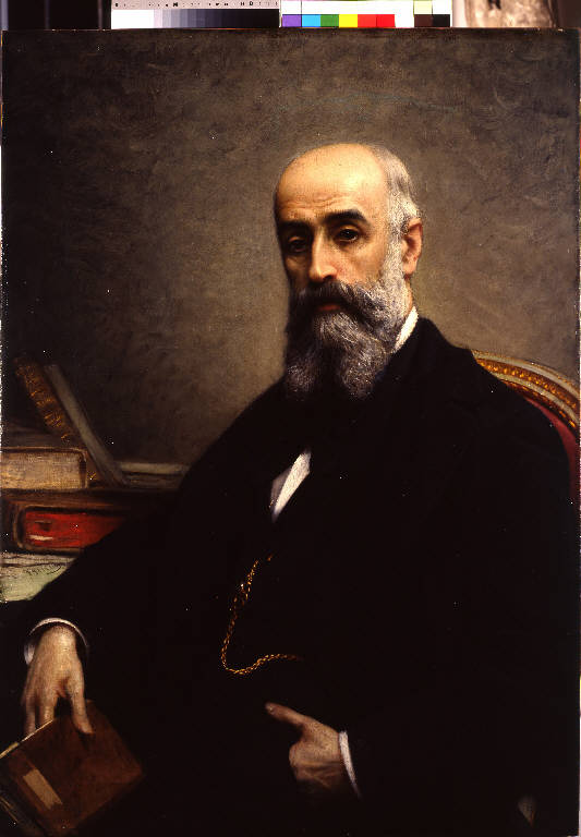 - NOTIZIE STORICO CRITICHE Così come accaduto con il ritratto del Caimi, anche questo ritratto potrebbe essere identificato con l'effige presentata a Brera all'Esposizione del 1889 con il titolo "Ritratto del conte Sebregondi. Sicuramente, venne presentato all'esposizione postuma delle opere del Bertini allestita nel 1899, nel cui catalogo è datato al 1888. L'impostazione del dipinto riprende quella del "Ritratto di Antonio Caimi" ma, se nel secondo non vi era alcuna nota ambientale, questo risulta arricchito dai libri impilati sulla sinistra, dei quali uno è tenuto inclinato quasi a scivolare, riscattando così la composizione dal rigido taglio di posa fotografica.