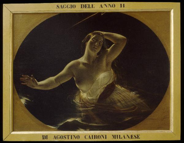 - NOTIZIE STORICO CRITICHE La tela non ha una datazione certa; si presume sia stata eseguita poco prima del 1850, data di acquisizione del dipinto in Accademia. Già nel 1845, Induno aveva presentato a Brera un dipinto avente lo stesso soggetto che riscosse molti successi in virtù della sua "sublimità". Caironi replica Induno, semplificando la composizione concentrandosi su un'unica figura e affidando l'effetto del dipinto ad un gioco di luce plumbea. Per questi effetti, il richiamo più vicino è al dipinto di Brjullov, "L'ultimo giorno di Pompei", che non passò affato inosservato alle Esposizione di Brera nel 1833.