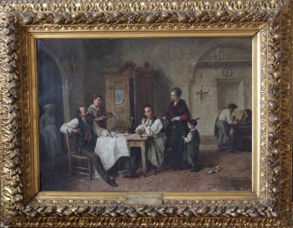 - NOTIZIE STORICO CRITICHE Tra il 1869 e l'anno della sua morte, Zuccoli si dedicò alla pittura cosiddetta di "genere", rappresentante complesse scene d'interni narrate con dovizia di particolari e sorrette da un perfetto equilibrio compositivo. Anche questo dipinto fa parte di quel filone e raffigura, in un interno di osteria, una giovane donna accompagnata dal figlio che sorprende il marito a bere e giocare a carte. Zuccoli sceglie un tema caro alla lettura popolare del tempo, che cerca di sdrammatizzare inserendo altre figure all'interno della scena: la serva, il compagno di gioco e il cuoco, quest'ultimo una citazione del fortunato dipinto eseguito dallo stesso artista, "Cuoco in cucina" (1852) conservato presso la Galleria d'arte Moderna di Milano. Anche la ricerca descrittiva dei particolari dell'arredo e la scelta dei colori contribuiscono a mutare in aneddoto un dramma familiare.