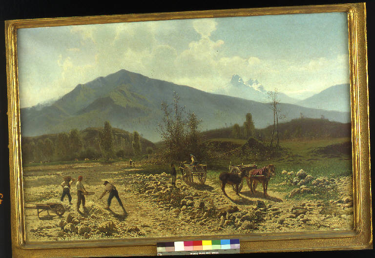 - NOTIZIE STORICO CRITICHE Il dipinto venne presentato all'Esposizione di Brera nel 1870: in quell'occasione, il pittore "otteneva il primato pel numero e la bontà de' suoi dipinti" (Mazza, in "La Lombardia", 3 settembre 1870, p. 1). Nella tela il Mongeri sottolineava che "la bravura dle pennello cede il posto ad una miglior bravura, quella da chi ama anzitutto il vero e lo comprende", mentre il Bomben metteva in risalto "il tocco originale" del pittore. Nella tela, di forte impatto verista, il paesaggio, illuminato da una calda luce solare, viene animato dalle figure di uomini e contadini intenti a lavorare. La stesura vibrante e gli effetti luministici, ricordano molto i modi di Filippo Carcano. con medesimo soggetto esiste un altro dipinto - di più piccole dimensioni - del Formis, "Lavoro nei campi presso Canzo", riferibile anch'esso al 1870.