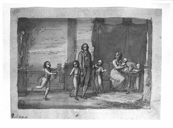 - NOTIZIE STORICO CRITICHE Il disegno è uno studio accurato di scena familiare dove Appiani ritrae una famiglia della nobiltà milanese vicina alla corte napoleonica (per A. Ottino della Chiesa si tratta della famiglia del vicerè Eugenio Beauharnais) in un momento di vita domestica. La scena si svolge nel giardino della villa (loggiato). Il disegno è probabilmente, data l'accuratezza nella definizione stilistica e compositiva e considerando la presenza della cornice che inquadra la scena, uno studio preparatorio (forse eseguito dal vero) per un ritratto su commissione privata da eseguirsi ad olio su tela di cui non si conosce l'esistenza.