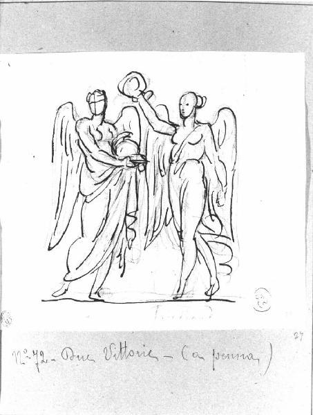 - NOTIZIE STORICO CRITICHE Il disegno, rappresentante due Vittorie alate, fa parte di una serie di studi eseguiti da Appiani in commemorazione delle vittorie dell'armata napoleonica (qui Eylan e Friedland). Il tema si inserisce nell'ambito della produzione appianesca di committenza napoleonica, lo stile, particolarmente veloce nell'andamento lineare, è proprio degli anni intorno al 1805-1810 circa. In quest'opera la presenza delle scritte permette di fissare il termine post quem al 1807 essendo questo l'anno della vittoria di Friedland. Il disegno faceva parte della collezione privata di Giuseppe Vallardi che, intorno al 1820 ordinò in album ben 344 disegni di Appiani. L'album, di formato atlantico, pervenne all'Accademia di Brera nel 1875 per donazione di E. Cernuschi, allora residenta a Parigi, dove lo acquistò nel 1856-1860 (periodo in cui a Parigi si tennero aste di vendita di opere di provenienza Vallardi).