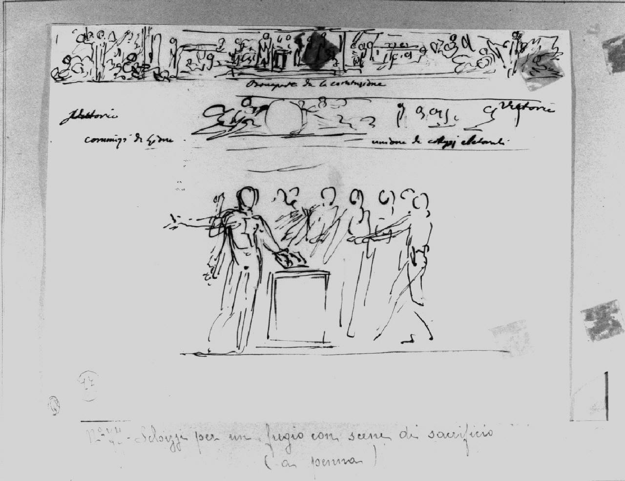 - NOTIZIE STORICO CRITICHE Il disegno è uno studio incentrato sul tema del giuramento. Al centro del foglio Napoleone che presenta la Costituzione su cui giurano un gruppo di uomini intorno ad un'ara. In alto veloci schizzi di fregio. Lo studio va collegato agli episodi di giuramento civile del ciclo dei Fasti napoleonici 1800/ 1807 ca., anche se non è riferibile ad un preciso episodio del ciclo che comprendeva 35 tele a tempera.