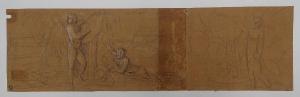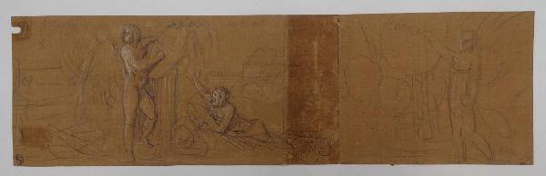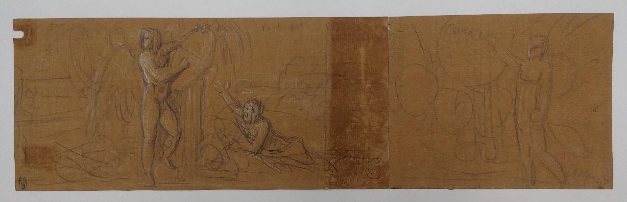 - NOTIZIE STORICO CRITICHE Il disegno è composto da due fogli distinti, con vergatura che segue due direzioni differenti. I fogli sono stati montati insieme nell'Album Vallardi sicuramente prima del 1935 (cfr. iscrizione Pacotto "c. 11 per 40" sul foglio di destra).\n\nIl foglio di sinistra, di maggiori dimensioni, recante il timbro Vallardi e il numero 98 cerchiato, è uno studio per l'episodio della "convenzione di Alessandria" che chiudeva l'ampio spazio dedicato alla "Battaglia di Marengo" del ciclo dei "Fasti napoleonici". Il disegno, stilisticamente databile all'inizio dell'Ottocento, è interessante perché permette di ricostruire il lungo e travagliato processo ideativo ed esecutivo di questo ampio ciclo pittorico.\n\nIl foglio di destra, di minori dimensioni, è uno studio per una composizione con una figura femminile alata rappresentata nell'atto di scrivere o indicare un'iscrizione all'interno di un medaglione. Al verso, due teste maschili, due schizzi di difficile interpretazione, un edificio.\n\nI disegni del foglio di destra non sono ancora riconducibili ad alcuna opera realizzata. Si è pertanto deciso di mantenere entrambi i fogli nella medesima scheda, fintanto che non emergano nuovi dati.