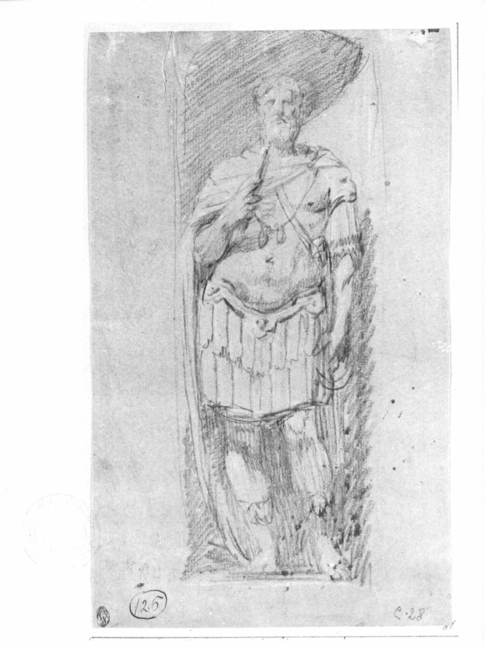 - NOTIZIE STORICO CRITICHE Precise indicazioni circa l'identità del soggetto di questo disegno di non sicura identità appianesca rappresentante una statua in nicchia, vengono fornite da una lunga scritta a matita sul verso del foglio. Si tratta di una statua rappresentante Filippo II re di Spagna, collocata nella torre di Piazza dei Mercanti a Milano. Nel 1797, durante la Repubblica Cisalpina, fu convertita in Bruto con la sostituzione del coltello al posto dello scettro. Si accenna poi ad un nuovo cambiamento con l'ingresso delle truppe Austro-Russe nel 1799. Il disegno costituisce testimonianza significatica di "manipolazione" delle immagini a fini propagandistico-celebrativi.