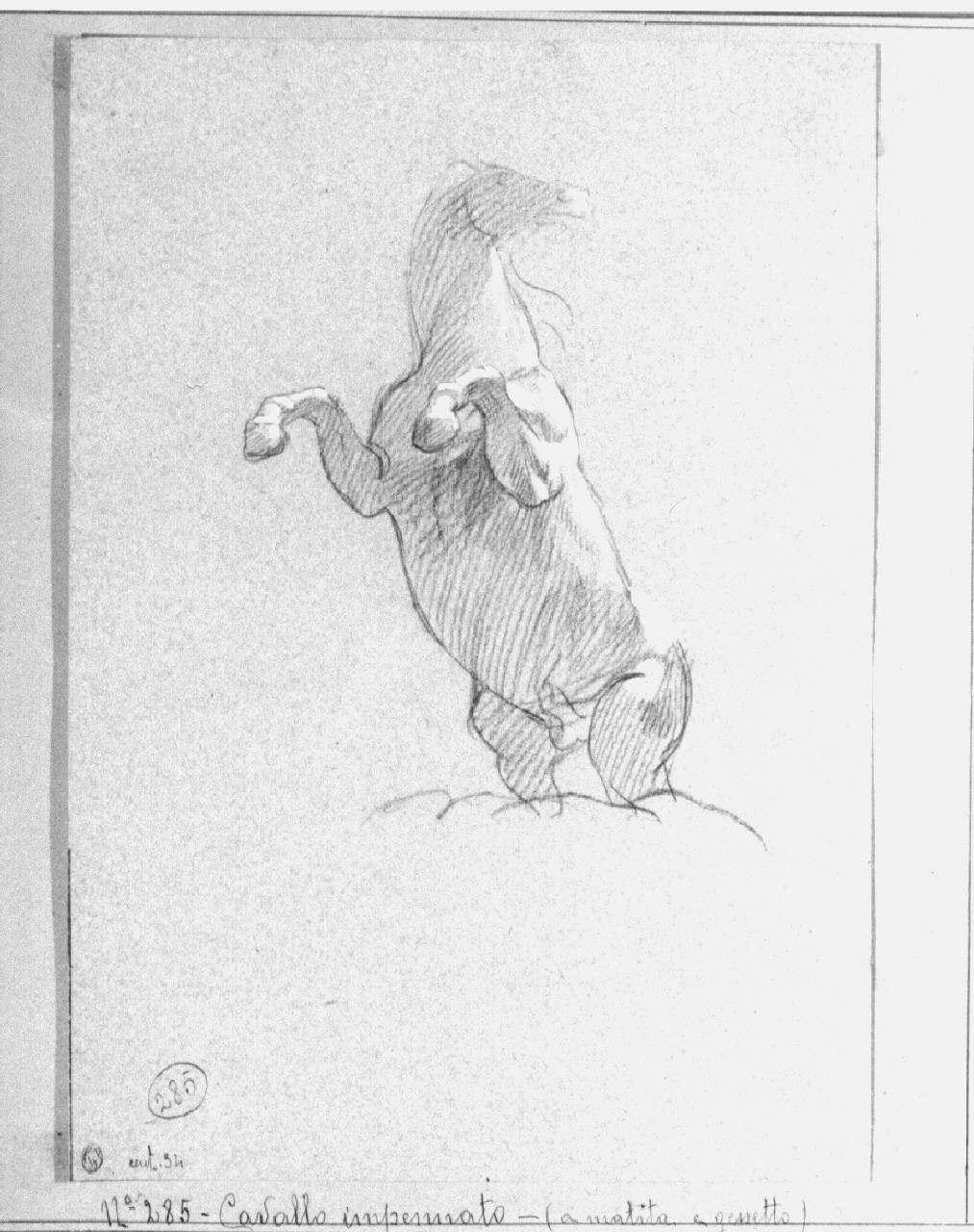 - NOTIZIE STORICO CRITICHE Il disegno è lo studio di uno dei cavalli per l'affresco rappresentante "Il carro di Apollo": l'affresco faceva parte di un ciclo dedicato alle storie di Apollo, eseguito tra il 1795 e il 1796 e ripreso, per essere concluso, nel 1800 nel Palazzo del Conte Sannazzaro. Nel 1814 la dimora, vi era allora il MInistro delle Finanze Prina, venne assalito e gli affreschi danneggiati, per cui si decise di staccarli e portarli nella Pinacoteca di Brera.
