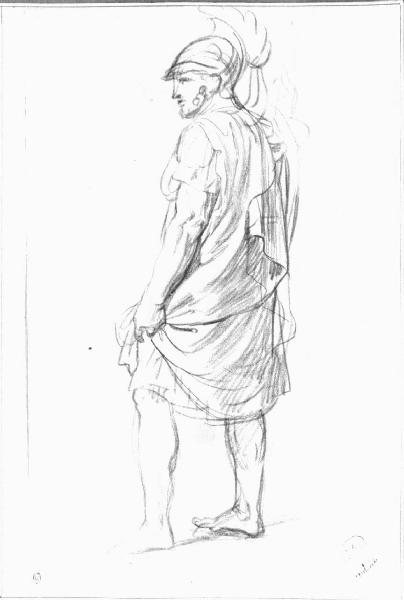 - NOTIZIE STORICO CRITICHE Il disegno è lo studio di guerriero romano, per uno degli episodi della "Continenza di Scipione", tratti dall'antica storia romana, che Appiani progettava di affrescare nella Sala della Lanterna di Palazzo Reale. Purtroppo l'ictus che colpì l'artista nel 1813 ne impedì la completa realizzazione.
