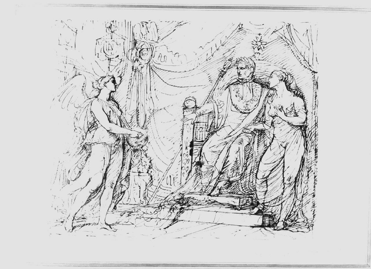 - NOTIZIE STORICO CRITICHE Il disegno è uno studio per il dipinto commemorativo della "Pace di Presburgo" eseguito da Appiani nel 1808 e di cui esistono alcuni studi con qualche variante nella posizione del volto di Napoleone. La composizione è inoltre simile a quella di uno dei dodici medaglioni allegorici del ciclo dei "Fasti napoleonici" rappresentante lo stesso episodio. La pace di Presburgo (26/11/1805) è simboleggiata dalla figura della Pace, a lato di Napoleone, che riceve dalla Vittoria un globo allusivo alla vastità delle sue conquiste.