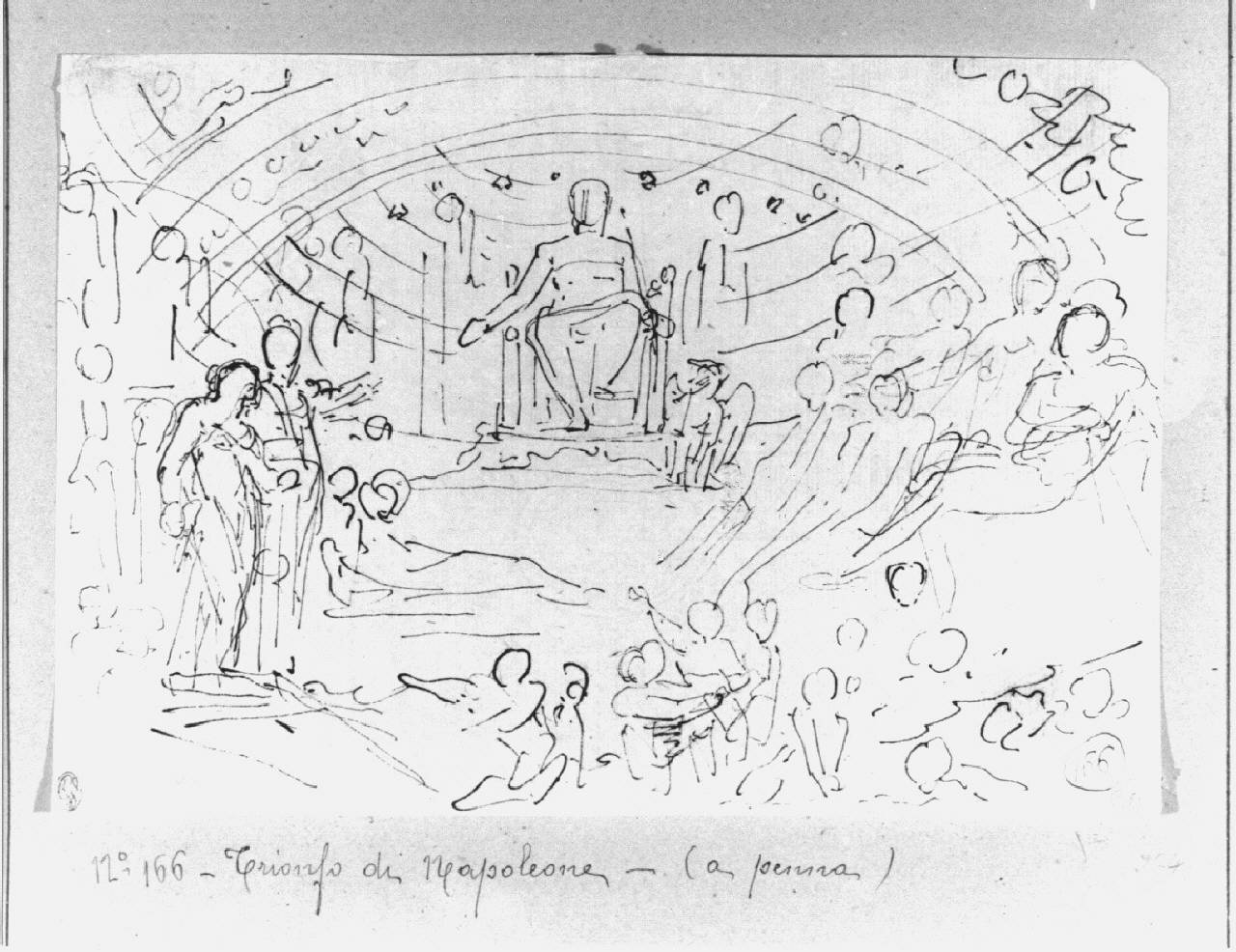 - NOTIZIE STORICO CRITICHE Il disegno è uno studio compositivo per "L'Apoteosi di Napoleone" affrescata da Appiani nel 1808 nella Sala del Trono di Palazzo Reale. E' uno dei pochi affreschi rimasti a documentare l'attività del maestro per Palazzo Reale. Ora, staccato, è conservato presso Villa Carlotta a Tremezzo. Lo studio presenta molte varianti rispetto alla soluzione finale, ma rimane valido il sistema compositivo.