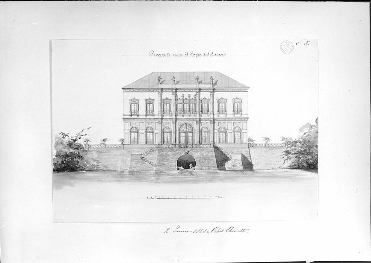 Prospetto di edificio a china e acquerello rosso, azzurro, verde e marrone, con ombreggiature. Edificio a 2 p. posto su terrazza con muro di contenimento: al centro darsena e scale a forbice d'accesso alla villa dal lago. Edificio con parte centrale in aggetto, conclusa da cornicione decorato da statue. Al pt. finestre ad arco. Al centro, entro lesene, porta a vetri. Al piano sup. finestre rettangolari timpanate. Cornici marcapiano a decorazioni floreali. Tetto a padiglione. Vista del lago prospiciente la villa e scorcio di vegetazione.