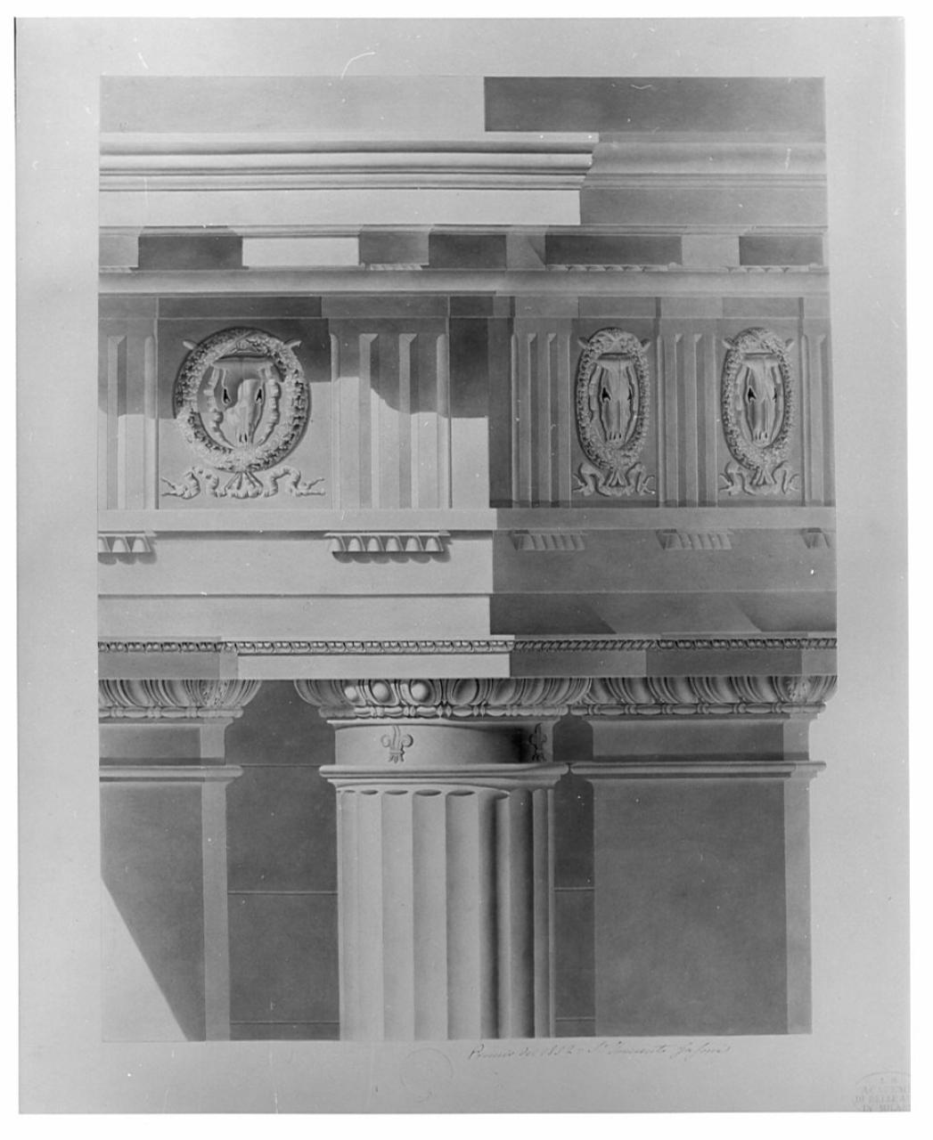 - NOTIZIE STORICO CRITICHE Disegno premiato nel 1852 nel concorso di II classe per il disegno degli ordini. Dal 1810 il concorso di II classe ammette due premi (medaglie d'argento): uno per l'invenzione e uno per il disegno degli ordini. La tavola è conservata nella cartella A I 194 che contiene i saggi premiati nei concorsi di II classe per l'invenzione e per il disegno degli ordini.