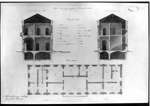 In alto a sin. e a ds. sezioni di edificio (AB e CD) a 2 p. con piano sotterraneo. Murature sezionate campite in acquarello rosa, murature dei locali in acquerello marrone chiaro e porte campite in marrone scuro. In basso pianta di edificio rettangolare con nurature campite in acquerello marrone e vani in acquarello rosa. All' interno dei locali numeri di riferimento alla legenda posta al centro della tavola.