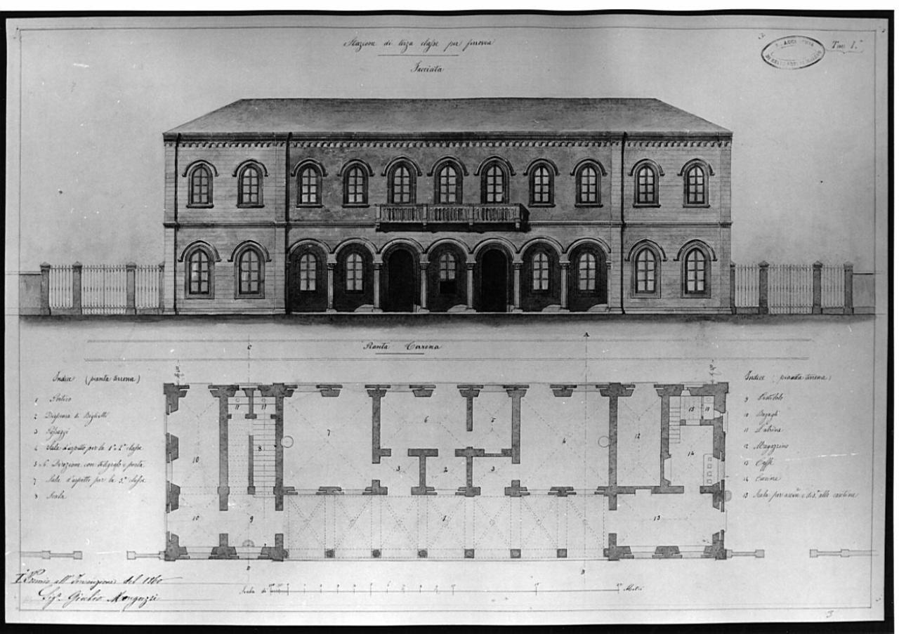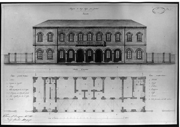 In basso pianta di edificio con murature campite in acquarello rnarrone e vani in acquerello rosa e porticato in grigio. Pianta simmetrica rettangolare con portico al centro e vani rettangolari ai lati. All'interno locali di forma regolare. Sup. disegno dei binari della ferrovia. In alto prospetto a china e acquarello di edificio a 2 piani, con porticato a 7 arcate al centro e lat. corpi in muratura (acquerello beige). Oltre il porticato arcate d'ingresso; sup. 7 finestre ad arco, in corrispondenza dei 3 archi centrali balcone con balaustra. Muratura in mattoni (acquerello rosso); cornice ad archetti ciechi pensili e tetto a padiglione.