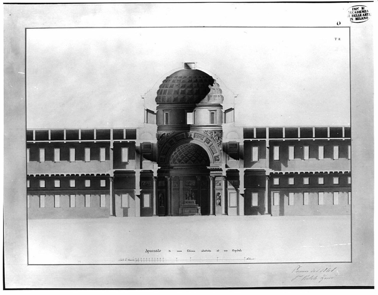 - NOTIZIE STORICO CRITICHE E' la seconda delle tre tavole presentate da Natale ferrè al concorso di II classe per l'invenzione del 1841. I disegni sono conservati nella cartella A I 194, contenente i saggi premiati ai concorsi di II classe della scuola di Architettura della Accademia di Brera.
