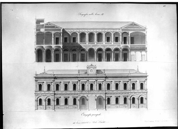 Sup. sezione di edificio a 2 piani con porticato al pt. e loggiato sup. tetto a padiglione. Al pt. porte rettangolari si affacciano sul porticato, al piano sup. 3 arcate centrali e lat. finestre rettangolari. Sezione delle volte di sostegno e delle capriate del tetto. Inf. : prospetto di edificio' a 2pp. con parte centrale e parti terminali in aggetto. Finestre ad arco sormontate da architravi. Al centro e nelle parti terminali al pt., arcate a tutto sesto. Al centro sul cornicione decorato è posto l'orologio.