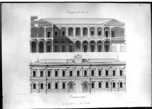 Progetto di piccola borsa con sale e lunghi accessori di servizio. architettura: edificio per una Borsa (prospetto e sezione)