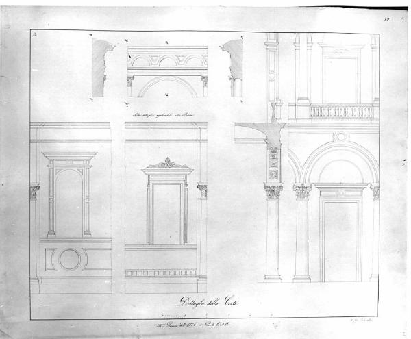 Dettagli di parti di edificio a china, con parti sezionate a tratteggio. In alto a sn. prospetto e sezione di trabeazione. In basso a sn. dettagli di due finestre. A ds. dettaglio (prospetto e sezione) di parte di facciata: al pt. arcata sostenuta da capitelli corinzi, sup. porta finestra con balaustra. La sezione mostra la decorazione dell'intradosso dell'arco.