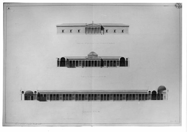 La tavola contiene un prospet to e due sezioni a china con ombreggiature più scure e murature sezionate campite in acquarello rosa. In alto: prospetto di edificio a 1 p.con pronao centrale esastilo preceduto da scalini e lat. facciata in mattoni a vista e 3 finestre rettangolari sormontate da timpano. Cornice a triglifi e tetto a padiglione. Al centro sezione di edifido a 1 p. con colonnato dorico e trabeazione a triglifi. Al centro pronao esastilo preceduto da scalini. Copertura a falde e central. cupola ribassata su gradoni. Alle estremità sez. del portico con vista di una cappella funeraria. In basso sezione di edificio a 1p. con colonnato dorico, posto su basamento e accessibile mediante scale. Trabeaz. dorica continua e tetto a padiglione. AlI'estremità a ds. portico e cappella con cupola e lucernario. A sin. portico ad archi e arco ribassato centrale.