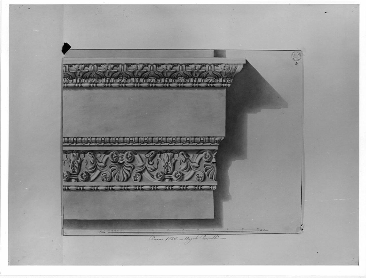 Dettaglio di cornice modanata a china e bistro con ombreggiature più scure. Cornice con modanature: astragalo, (fusaroli e perle) listello, modanatura a motivi fitomorfi, listello, gola rovescia, fregio liscio, astragalo, gola rovescia ad archetti e boccioli a listello.
