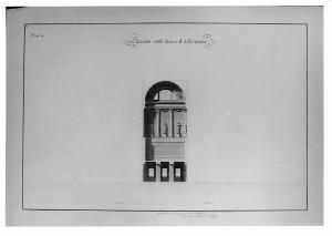 Sezione trasversale di parte di edificio a china e bistro con ombreggiature più scure, murature sezionate campite in acquarello rosa e terreno sfumato campito in acquarello rosa, al p. t. 3 archi con porta rettangolare, sup. muratura a mattoni a vista e sup. basamento sul quale poggiano 2 colonne corinzie (al centro) e lat. 2 pilastri. All'interno delle colonne statue su piedistallo. Sup. trabeazione e finestra termale decorata da fascia semicircolare. Copertura a volta.