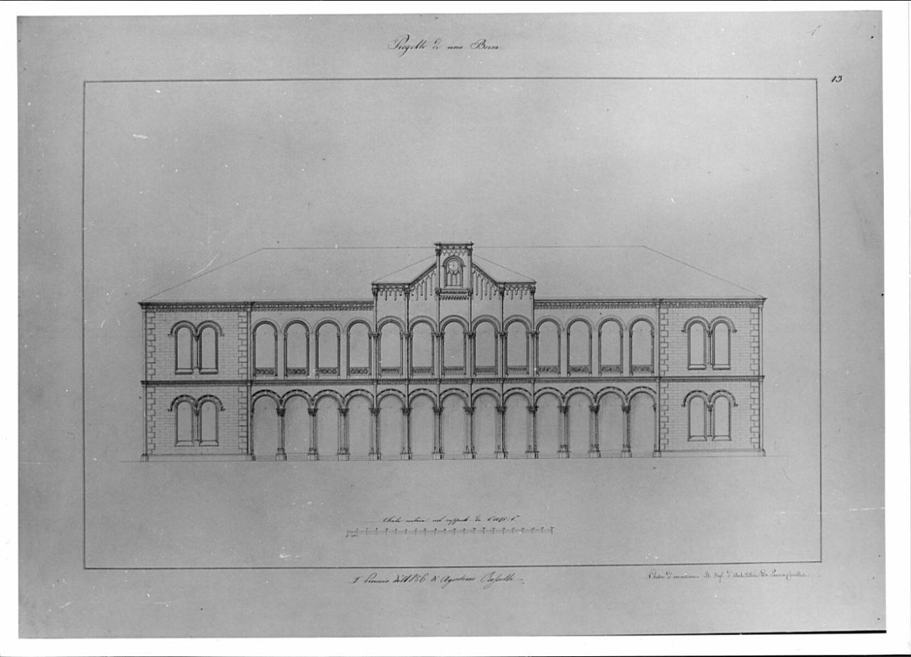 - NOTIZIE STORICO CRITICHE Appartiene ad una serie di 4 tavole presentate da Agostino Rosselli al concorso di II classe per l'invenzione del 1856. La tavola è conservata nella cartella A I 194, contenente i saggi premiati ai concorsi di II classe della scuola di Architettura della Accademia di Brera.