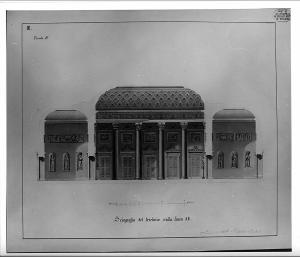 Sezione di edificio a china e bistro con murature sezionate campite in acquerello rosa e con ombreggiature più scure. Edificio simmetrico composto da 3 vani: al centro salone con coperura a volta cassettonata e diaframma di 4 colonne corinzie scanalate, su fondo parete su cui si aprono 5 porte rettangolari sormontate da cornice e riquadro a bassorilievo. Ai lati vani con 3 nicchie con statua.