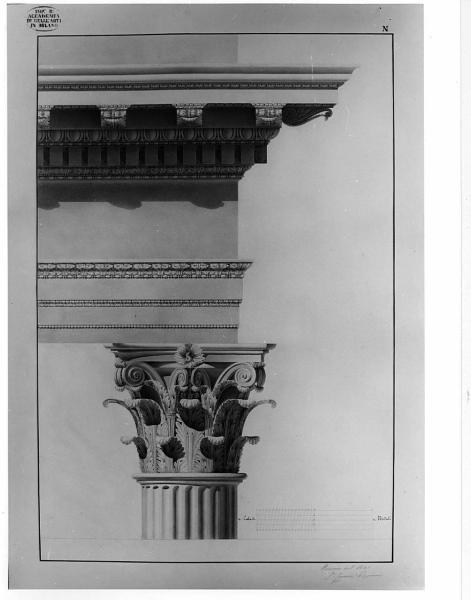 - NOTIZIE STORICO CRITICHE Disegno premiato nel 1841 nel concorso di II classe per il disegno degli ordini. Dal 1810 il concorso di II classe ammette due premi (medaglie d'argento): uno per l'invenzione e uno per il disegpo degli ordini. La tavola è conservata nella cartella A I 194 che contiene i saggi premiati nei concorsi di lI classe per l'invenzione e per il disegno degli ordini.
