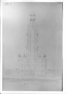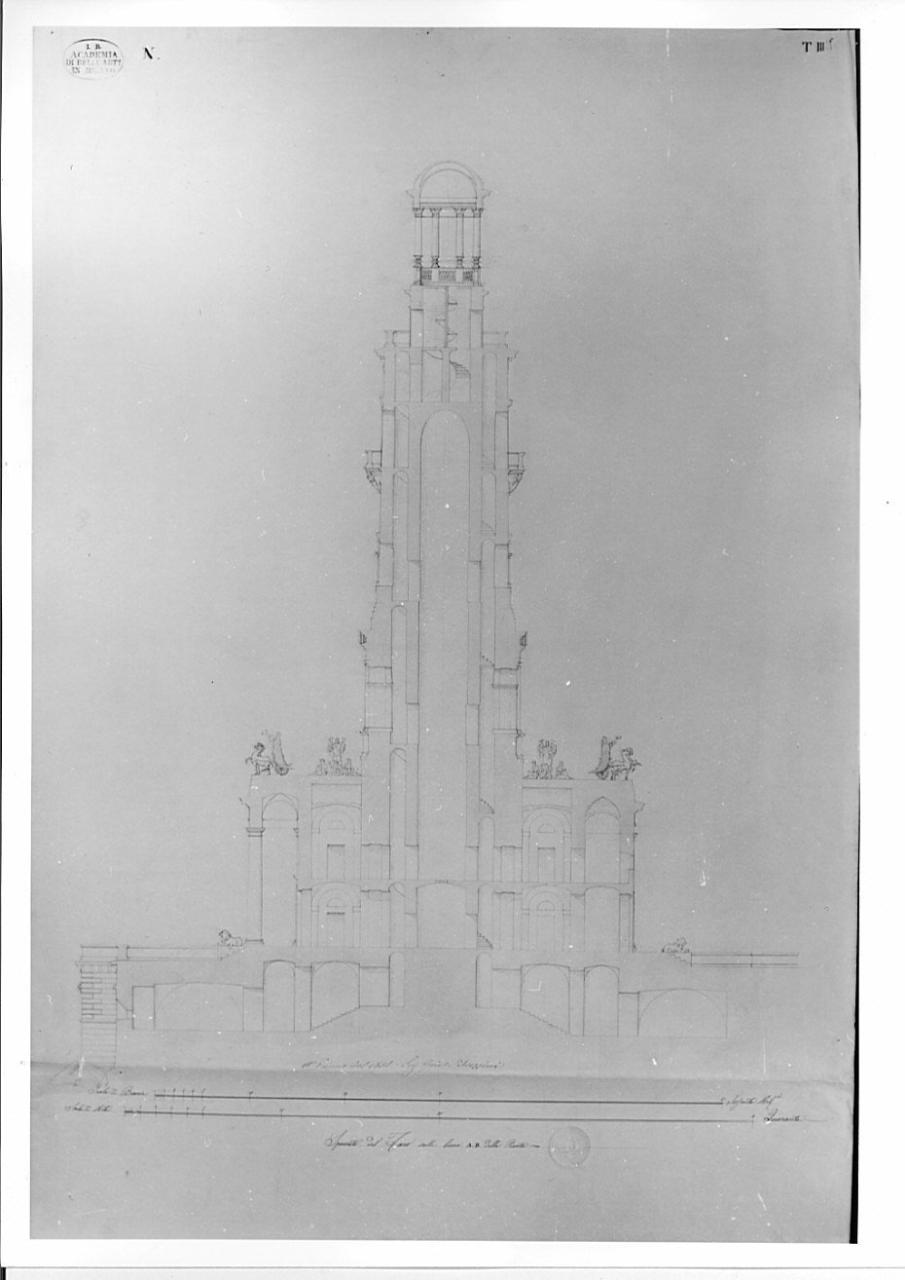 Sezione di torre a china, con murature sezionate campite in acquarello rosa. Inf. sezione del bastione con vista dei vani interni, sup. corpo d'ingresso alla torre a 2 piani con pronao a sin. Sulla sommità gruppi scultorei. Al centro corpo della torre con scale elicoidali d'accesso alla lanterna posta sulla sommità all'interno di tempietto semicircolare coperto a cupola.