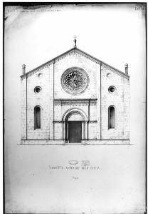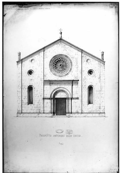 Progetto di restauro per la chiesa di San Francesco a Brescia. Realizzata su carta pesante. Prospetto della facciata. Fronte della chiesa con tetto a capanna. Portale centrale con fascia di archetti al di sopra. Ai lati del portale due alte monofore a tutto sesto e al di sopra due oculi sormontati da altri due oculi ciechi. Rivestimento in pietra a vista.
