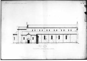 Progetto di restauro per la chiesa di San Francesco a Brescia. Realizzata su carta pesante. Prospetto laterale di chiesa. con forme romaniche con tetto a salienti e facciata a capanna. Transetto in lieve aggetto. Volume del coro ribassato e abside circolare di ridotte dimensioni. Fianco scandito da cinque piatte lesene 4 monofore a tutto sesto. Nell'alzato del corpo centrale cinque coppie di monofore di piccole dimensioni, corrispondenti alla divisione inferiore delle lesene.