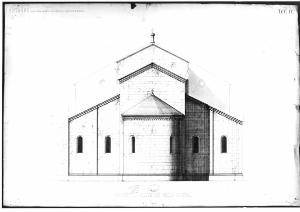 Progetto di restauro per la chiesa di San Francesco a Brescia. Realizzata su carta pesante. Prospetto posteriore di chiesa di forme romaniche con tetto a salienti e facciata a capanna. Le navate sono spartite da una lesena e al centro della semifronte una finestra ad arco a pieno centro. Alla sinistra è accennato un corpo architettonico che si accosta alla chiesa. Abside semicircolare segnato da due finestre simili alle altre e chiuso in alto da una teoria di archetti incrociati.