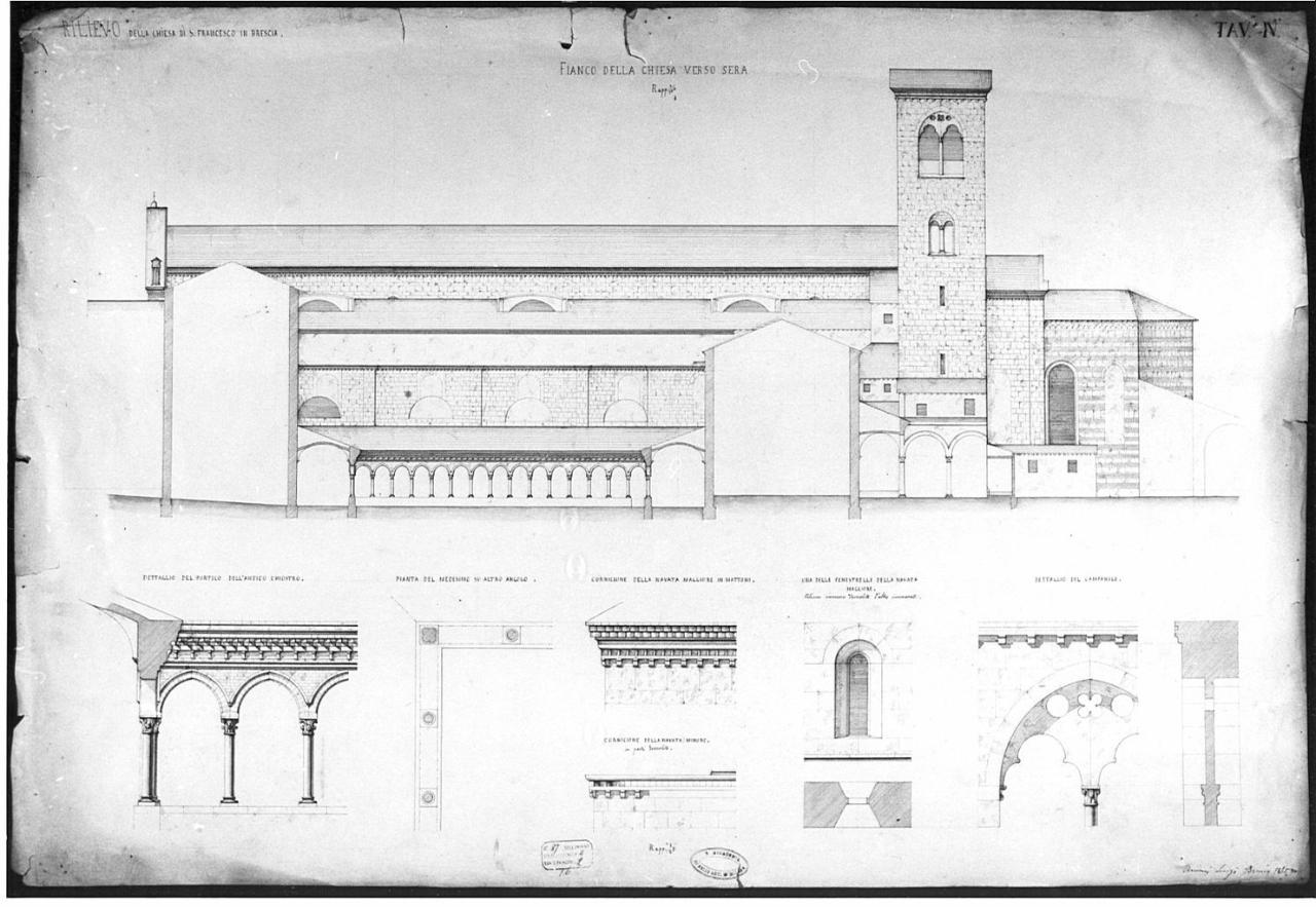 Ristauro interno ed esterno della chiesa di San Francesco di Brescia. architettura: chiesa di San Francesco a Brescia (fronte del fianco destro e dettagli)